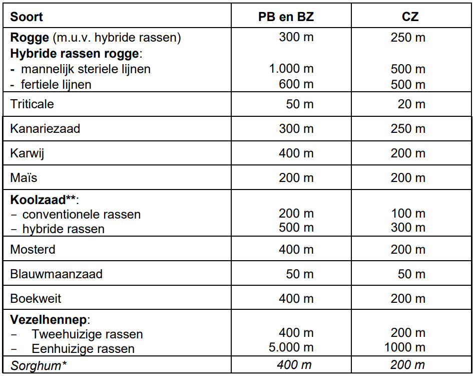 Voor kruisbestuivende gewassen gelden de volgende isolatieafstanden ten opzichte van andere rassen van hetzelfde gewas en andere gewassen die gevaar voor kruisbestuiving opleveren: