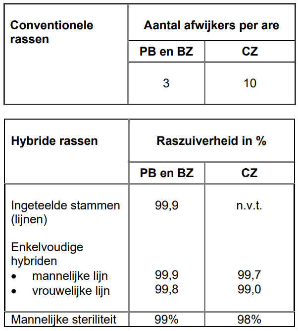 - Prebasiszaad en basiszaad : max. 1% duidelijk afwijkende kolven