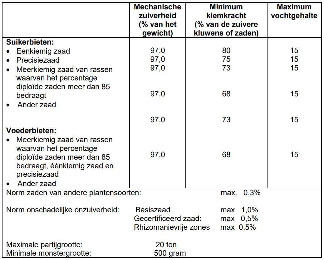 - Precisiezaad van suikerbieten: tenminste 70% van de gekiemde kluwens moeten één zaadkiem geven. Het percentage kluwens met drie of meer kiemen mag niet meer dan 5 bedragen, berekend op de gekiemde kluwens.